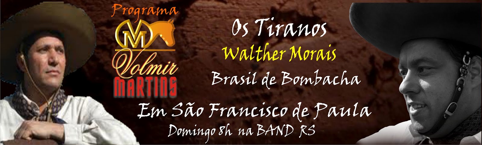 O Programa do Volmir Martins, que vai ao ar todos os domingos às 8:00 hs, pela Band TV, trará como atrações neste domingo de páscoa nomes como Jardel Borba e Brasil de Bombachas, Os Tiranos e Walther Morais. O televisivo gauchesco que é um sucesso de audiência e que tem a direção do tradicionalista Rogério Bastos, foi gravado em minha querência, São Francisco de Paula.